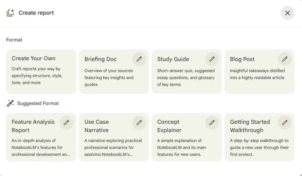 It can generate different types of Reports like Study Guide, Briefing Doc, Blog Post, and many more.