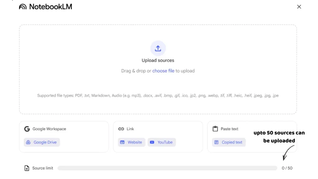 Upload: PDFs, Docs, links, or notes, URL, YouTube URL, Audio {Supported file types: PDF, .txt, Markdown, Audio (e.g. mp3), .docx, .avif, .bmp, .gif, .ico, .jp2, .png, .webp, .tif, .tiff, .heic, .heif, .jpeg, .jpg, .jpe.}